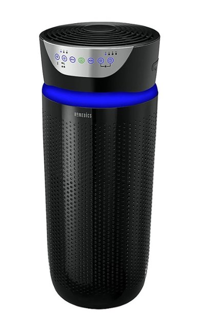 Improve the air quality in extra-large rooms up to 343 sq. ft. with the HoMedics TotalClean Deluxe UV 5-in-1 Tower Air Purifier! With 360deg true HEPA filtration, this Black tower air purifier removes up to 99.97% of airborne allergens as small as .3 microns. The prefilter captures larger particles while the carbon filter reduces odors and VOCs. The UV-C light can kill up to 99.9% of bacteria and viruses while the built-in particle sensor monitors indoor air quality. Choose between 5 speed options with whisper-quiet sleep mode and optional night-light. A remote control and 3 essential oil aromatherapy pads are included.