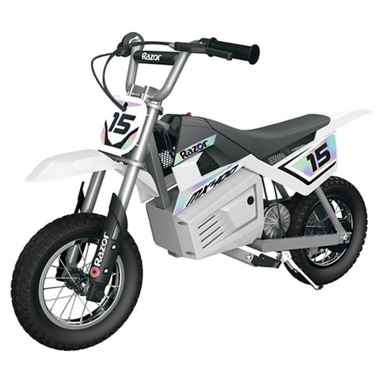 Your kid isn't afraid of a little dirt. The Razor MX400 Dirt Rocket is ideal for kids and teens ages 13 years and older who want to enjoy a revved-up version of the off-road dirt bike experience. This dirt bike is a high performance, electric-powered, scaled-down motocross bike with authentic dirt bike frame geometry and Supercross-inspired styling. With a high-torque, powerful 350-Watt electric motor, large 12-inch pneumatic knobby tires for maximum power transfer, speeds up to 14 miles per hour, and up to 30 minutes of continuous use (up to 10 miles on a single charge), you'll be the king of the dirt hill. The road (and the fun) doesn't stop where the sidewalk ends and your kid can explore it with the Razor MX400 Dirt Rocket.